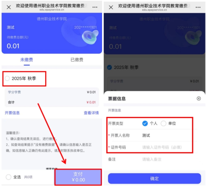 (2)票据类型默认为“个人”,请确认姓名、证件号码(若默认显示为14位考生号,请修改为18位身份证号)无误后,点击“确认”并完成支付。