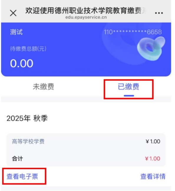 8.获取发票:缴费成功后生成电子票据。您可在“已缴费”菜单中找到“查看电子票”选项,进行下载或发送至邮箱。